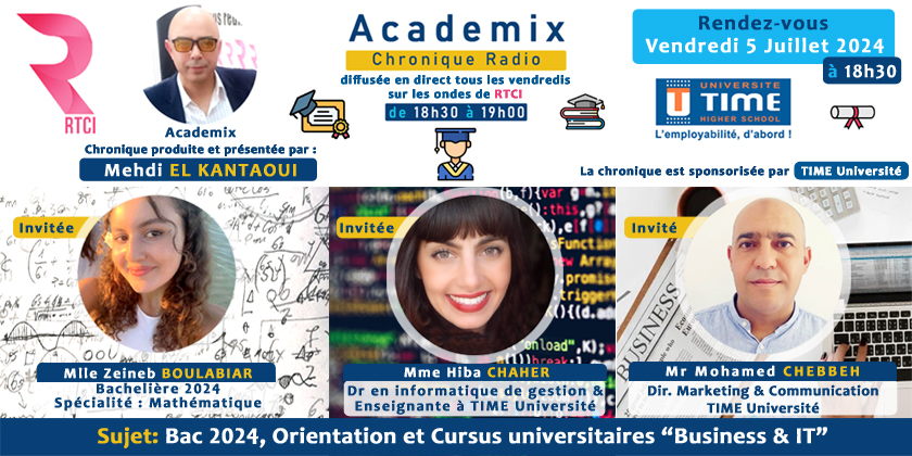 L’objectif de la chronique Academix du vendredi 5 juillet 2024 était de mettre en avant les cursus universitaires Business et IT proposé par TIME UNIVERSITE.