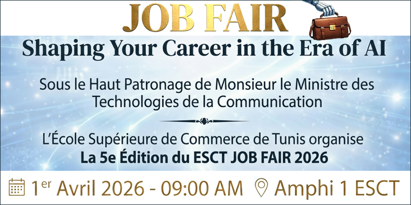 L’École Supérieure de Commerce de Tunis (ESCT), relevant de l’Université de La Manouba, organise le 1er avril 2026 la 5ᵉ édition de son Job Fair, placée cette année sous le thème : « Shaping Your Career in the Era of AI ».