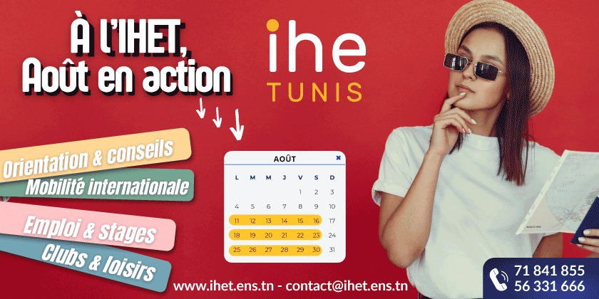 Bachelier, étudiant, parent ou simple curieux, le mois d’août est l’occasion rêvée pour découvrir l’Institut des Hautes Études de Tunis (IHET) à travers ses Journées d’Orientation. Organisées tout au long du mois, ces journées constituent un rendez-vous incontournable pour celles et ceux qui souhaitent construire un parcours académique solide et ambitieux. Un programme riche et […]